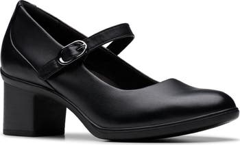 An adjustable mary jane strap offers a retro aesthetic and secure fit on a streamlined leather pump featuring premium underfoot cushioning and a chunky, stacked heel.