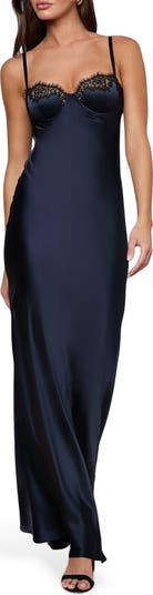 Glossy skin-skimming satin made from luxurious silk enriches the look and feel of this slinky slipdress romanced by lovely lace at the underwire cups.