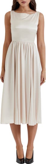 This floaty midi dress is cut from smooth satin and designed with darts along the bodice creating a fit-and-flare silhouette.
