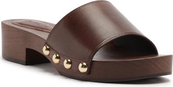 Round studs gleam at the sides of this walkable slide sandal balanced on a wooden low block heel and platform.