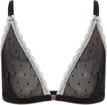 The polka dot tulle fabric meets the triangle shape to offer an elegant and feminine look. Contrast lace details highlight its sophisticated design. Adjustable straps and a front closure at the center provide comfortable and secure wear. Complete the look with the Shayla Garter Thong.