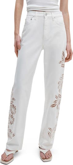 Enjoy the whimsical flair of these straight-leg jeans, cut from bright-white nonstretch denim and finished with an arresting floral eyelet pattern.