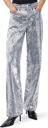 Shimmering sequins channel glam rock on these faded, straight-leg jeans cut from nonstretch denim.