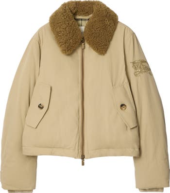 A jacket in cotton nylon gabardine, washed for a soft finish and padded with goose down and feathers. Part of our Gabardine Capsule, the design pays homage to the house’s iconic signature – a revolutionary fabric invented by Thomas Burberry, worn by explorers and everyday adventurers alike. Inside the jacket is lined with the Burberry Check and features a specially designed label inspired by an archival campaign. Cut to a regular fit, the style is finished with a detachable shearling collar and our Equestrian Knight Design embroidered in metallic threads.||Two-way zip closure|Detachable collar|Side button flap pockets|Drawcord hem|Velcro-tab and storm cuffs|Embroidered Equestrian Knight Design at sleeve|Comes with a garment bag