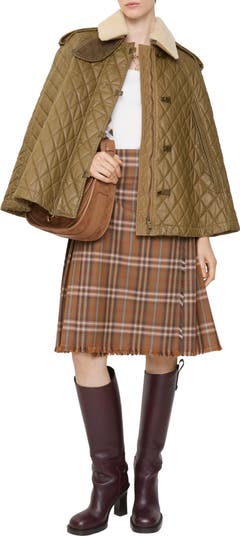 Our signature quilted styles are reimagined as a cape in cotton poplin, treated for a distressed finish and lined with a tonal Burberry Check. The Heath features a corduroy collar layered with a detachable shearling trim for a textural contrast. Epaulettes and a throat latch nod to our signature trench, while logo-engraved clip hardware has an antique finish for a vintage feel.||Press-stud, zip and clip closure|Throat latch|Epaulettes|Detachable shearling collar|Burberry Check lining and undercollar|Comes with a garment bag