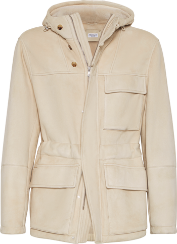 - Double closure with zip and snapsCollar may be worn raisedLined hood and adjustable drawstringUpper patch pocket with flap and buttonPatch hand pockets with flap and buttonShearling liningDrawstring waist