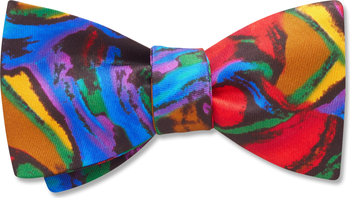 Practically irresistible, this black silk twill bow tie is covered with abstract splatters of blue, orange, gold, purple, red, and green, making it a vibrant addition to any outfit.