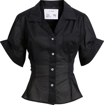 Box pleats create a flared hem for this sheer button-up shirt that gets a contemporary look from rolled split-cuff sleeves and tailored seaming.