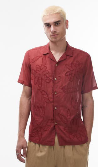 Tonal embroidery keeps the blooms low-key on this camp shirt cut for a relaxed fit that makes the most of the sheer, airy cotton-rich fabric.