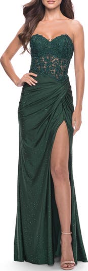 Strapless gown with sweetheart neckline and ruched jersey skirt. The sheer bodice features lace applique and rhinestones. Back zipper closure.