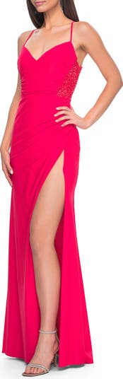 La Femme Sheer Lace Side Panel Jersey Long Dress in Hot Coral, Main, color, Hot Coral