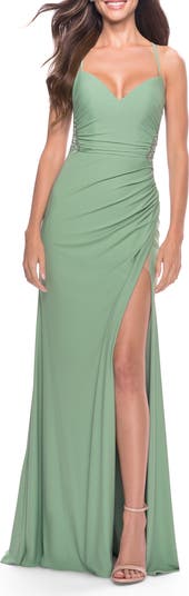 Stylish soft jersey long dress with ruching along the front and a high slit. The gown features lace applique sheer side panels and a lace up back. Back zipper closure.