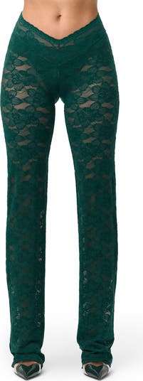 A V-cut waist adds to the flirty charm of these sheer lace pants detailed with a romantic floral design.
