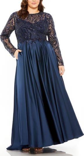 Satin gown featuring a beaded top with sheer long sleeves for a touch of glamour. Perfect for an elegant and refined look at formal occasions.