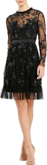 Cocktail dress with sheer embroidered overlay, long sleeves, and floral appliqué—perfect for formal parties, weddings, or elevated evening events.