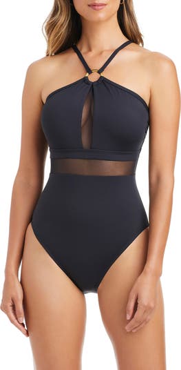 Sheer mesh insets show off a peek of your skin as you lounge poolside in this curve-skimming one-piece swimsuit.