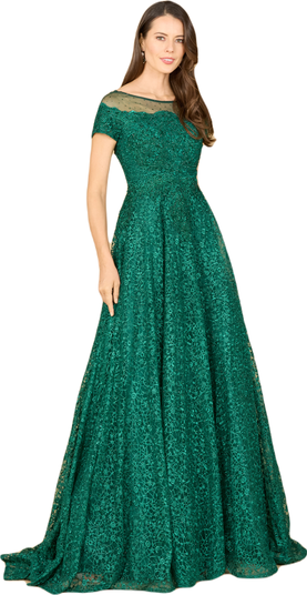 One of our best selling ball gowns! Short sleeve lace ball gown covered in lace appliques and rhinestones with an off shoulder illusion neckline.