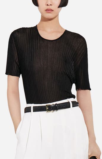 A refined essential in lightweight ribbed viscose, designed to skim the body with a clean, elongated line. Mixed rib texture adds quiet dimension while the semi sheer finish lends softness and lightness for layering. Finished with a slim short sleeve and a neat crew neckline for easy tucking and polished proportion.