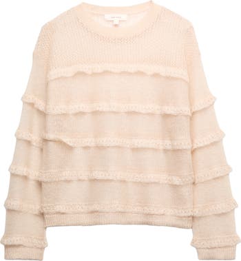 A breezy open knit and tiers of tonal ruffles add to the boho-inspired vibe of this mohair-kissed sweater.