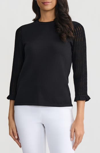 Sheer, ribbed three-quarter sleeves with ruffles at the cuffs frame this ultralightweight sweater, adding a subtle-yet-charming touch to your look.