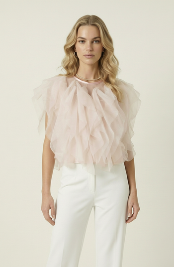 Sheer tulle and cascading layered ruffles bring dramatic volume, soft movement and romantic sophistication to this statement blouse.