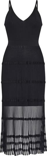 Soft ribbing shapes this silhouette of this metallic-accented midi punctuated with a semi-sheer hem for unexpected contrast.