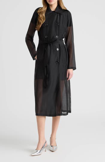 This sheer trench coat is tailored with princess seams for a refined, modern silhouette. Designed with a double-breasted front and a clean spread collar, it's finished with shoulder tabs, a V-shaped back storm shield and a matching belt for polished definition.