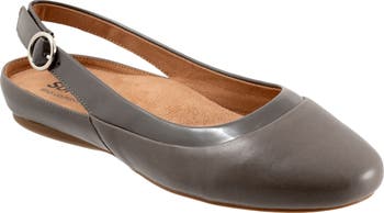 Memory foam cushioning and built-in arch support offer superior underfoot comfort and stability on a luxe leather flat fastened with an adjustable slingback strap and buckle closure.