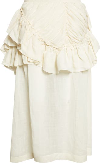 Crafted from weightless ramie mousseline, this convertible skirt reserves its volume for the top section, with its dramatically ruched and ruffled layers. Wear yours as a mini or a midi, as the bottom skirt panel is detachable for versatility.