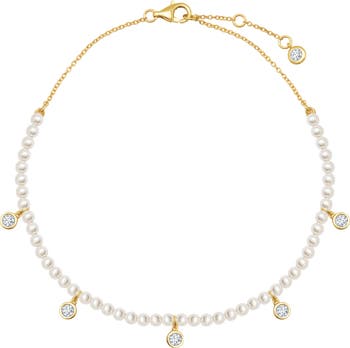 Hand-set cubic zirconia bezels dangle from this shell pearl anklet highlighted with a delicate chain plated in 18-karat gold.