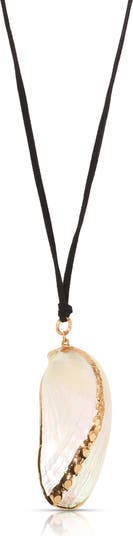 Add the perfect touch of retro sophistication to your look with this gilded shell necklace on a faux-suede cord.