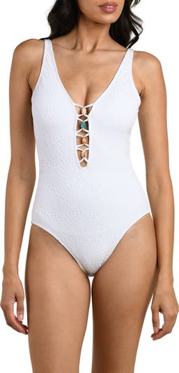 La Blanca Shellbound Plunge One-Piece Swimsuit, Alternate, color, White