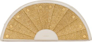 This statement clutch inspired by handmade fans and seashells features striking paneling, pleats and a removable strap.