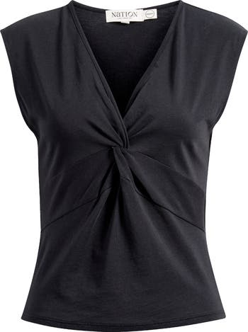 A twisted front shapes the silhouette of this close-fitting sleeveless top cut with a deeply dipped neckline.