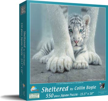 Awaken your creativity with the Sheltered 550 piece jigsaw puzzle for adults by SunsOut Puzzles, that takes you into the heart of nature with an enchanting scene depicting a white tiger cub seeking shelter beneath its mother’s protective paws. This exquisite depiction, crafted under license from the breathtaking artistry of renowned artist Collin Bogle, is not just a compelling pastime, but a delightful piece of art poised to add grandeur to any home collection. Deciphering this challenging yet engaging masterpiece, which measures 15.5” x 18” upon completion, becomes more satisfying due to SunsOut’s legendary interlocking pieces. Precision-cut into random shapes, these durable high-quality recycled cardboard pieces fit together seamlessly, thus promising a smooth assembly process. SunsOut Puzzles are crafted with eco-friendly materials, showing our commitment to safeguarding nature's majesty by utilizing soy-based inks and the highest quality recycled board. These splendid puzzles, proudly made in the USA, resonate with our commitment to quality and customer satisfaction – our dedicated customer service stands ready to assist should any piece be missing or damaged. With SunsOut Puzzles, your leisure time transforms into an artistic journey that both respects and celebrates the beauty of our natural world, offering an immersive experience for puzzle enthusiasts who value quality, beauty, and sustainability.