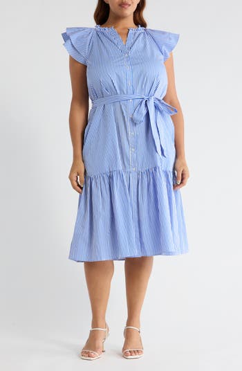 Ruffle trim provides a flawlless finish for this belted midi dress patterned in narrow stripes.