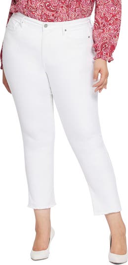 A light wash and frayed hems lend lived-in appeal to slim-fit jeans fashioned in an abbreviated length. Exclusive lift-tuck technology smoothes and supports in front and lifts in back.