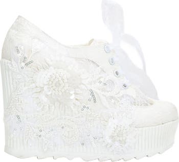 These bridal sneakers feature a 4.3-inch platform outsole height (11 cm) that is adorned with pearls. The ivory-colored upper is adorned with meticulously handcrafted flower shaped lace crochet details and pearls, adding an elegant touch to every step you take. The sheer shiny ribbon shoe laces add to the glam of these bridal wedge sneakers, making these platform wedding sneakers a perfect choice for any bride who wants to be comfortable and glamorous on her special day. Whether you're looking for a unique way to express your style or simply want to keep your feet comfortable during your wedding reception, these lace wedding sneakers are a perfect choice. These shoes are designed to fit true to size, so we recommend ordering your regular size.