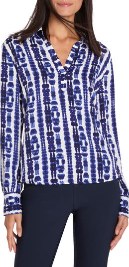 Shibori-inspired dye patterning brings artful stripes to this V-neck pullover top framed by billowy bishop sleeves.