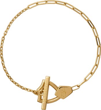 A bracelet made in Italy from brass with gold plating, constructed from chain links in contrasting sizes. The T-bar is secured with a shield shape inspired by our Equestrian Knight Design.||Engraved Burberry lettering at T-bar|Comes with a dust bag