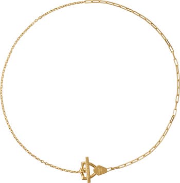 A necklace made in Italy from brass with gold plating, constructed from chain links in contrasting sizes. The T-bar is secured with a shield shape inspired by our Equestrian Knight Design.||Engraved Burberry lettering at T-bar|Comes with a dust bag