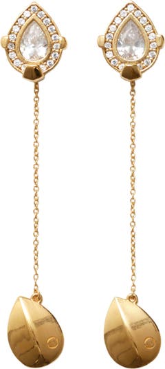 A pair of earrings made in Italy from sterling silver with gold plating. The shield is inlaid with cubic zirconia and features a detachable cover that can be unclipped to hang as a chain-link drop pendant or removed to wear as stud earrings.||Engraved rose at pendant|Pierced jewellery cannot be returned. This does not affect your statutory rights.|Comes with a dust bag