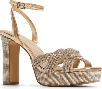 Glistening rhinestones amplify the glam appeal of a platform sandal adorned with interlocking straps and set on a soaring block heel. A dual-density foam footbed offers lasting comfort.