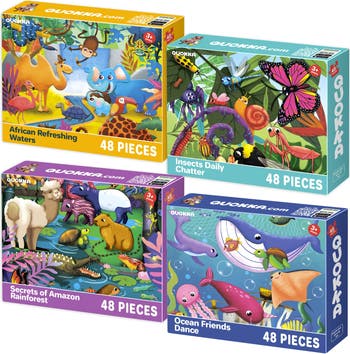 This exciting 4-pack puzzle set is perfect for toddlers and preschoolers, featuring a mix of shimmer and animal-themed puzzles. Each puzzle includes 48 pieces, designed with unique shapes that make them both challenging and fun. With vibrant colors and special shimmer effects, these puzzles help young children develop fine motor skills, problem-solving abilities, and creativity. Themes include animals, princesses, cars, and nature, offering a variety of engaging content that keeps kids entertained while learning. Designed for children aged 3-6, these puzzles are ideal for screen-free play, providing an opportunity for kids to enhance their concentration and shape recognition. The durable, eco-friendly materials ensure safe play while making these puzzles a thoughtful gift for any occasion.