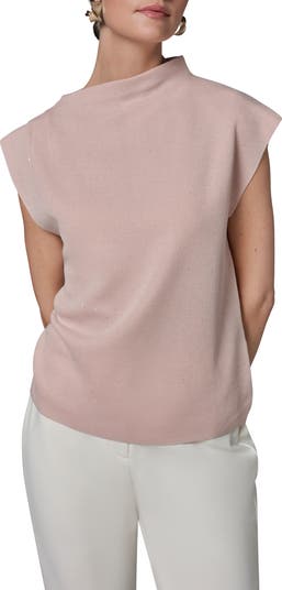 Tiny twinkling rhinestones add shine to this soft cap-sleeve sweater topped with a high asymmetric neckline.