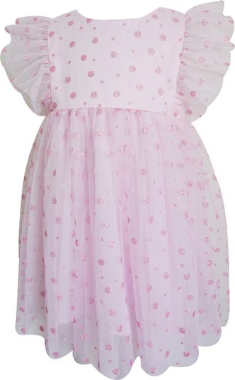 Glittery polka dots add to the already-considerable charm of this pinafore-inspired frock crafted of tulle and framed with sweet flutter sleeves.