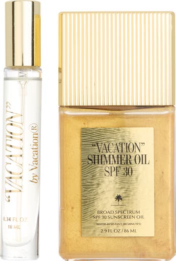 What it is: 'VACATION' Shimmer Oil SPF 30 is 'Black Tie' Sunscreen. Boasting two types of show stopping shimmer—a pearlescent glaze alongside gold mica flecks—this premium-grade body oil includes Vacation's award-winning scent, SPF 30 protection and a lavish blend of naturally derived oils that will turn any poolside moment into a dazzling red-carpet event.