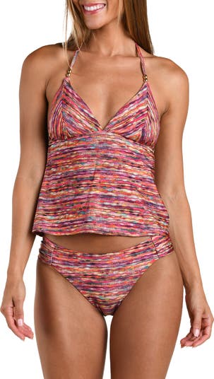 A slightly cropped silhouette gives modern flair to this vibrant tankini top popped with glossy golden beads.