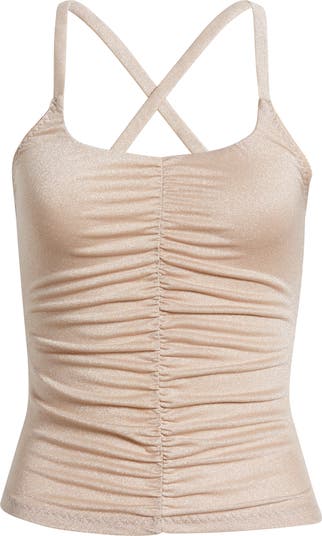 Shimmery metallic fibers catch the light on this ruched camisole suspended from slender straps.
