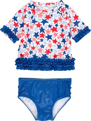 Signature ruffles lend playful energy to this precious two-piece swimsuit with a long-sleeve rashguard and coordinating bottoms.
